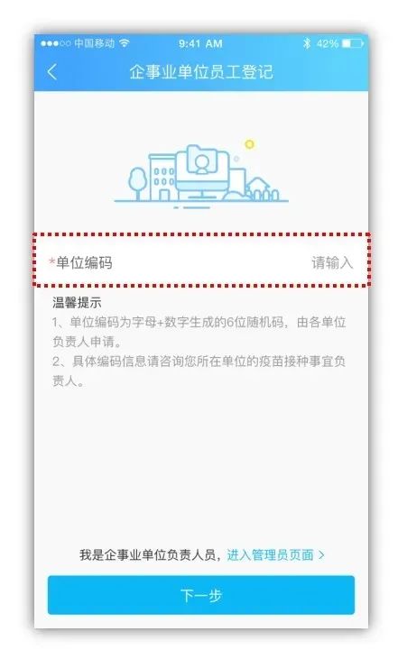 單位職工將負(fù)責(zé)人下發(fā)的六位單位編碼正確輸入后,進(jìn)入下一步。(點(diǎn)擊負(fù)責(zé)人分享鏈接直接進(jìn)入下一步)