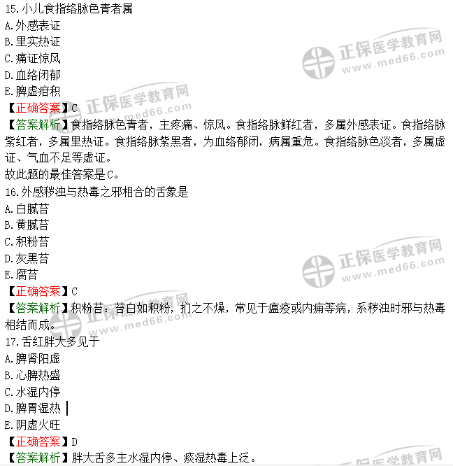 【答案解析】青色主寒證、氣滯、血瘀、疼痛和驚風(fēng)。選項(xiàng)D中水飲是屬于黑色的主病。故此題與題干符合的最佳選項(xiàng)是D。