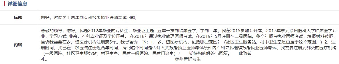 考生咨詢:尊敬的領(lǐng)導(dǎo),您好。我是2012年畢業(yè)的??粕?,畢業(yè)證上是五年一貫制臨床醫(yī)學(xué),學(xué)制二年。我在2015年參加專升本,2017年拿到徐州醫(yī)科大學(xué)臨床醫(yī)學(xué)專業(yè),學(xué)習(xí)方式:業(yè)余,本科畢業(yè)證及學(xué)位證書, 在2018年通過執(zhí)業(yè)助理醫(yī)師考試,在2019年5月注冊在二級醫(yī)院。我今年報考執(zhí)業(yè)醫(yī)師考試,填報材料被拒,告訴我需要在鄉(xiāng)、鎮(zhèn)醫(yī)療機(jī)構(gòu)注冊滿5年。我想咨詢一下: