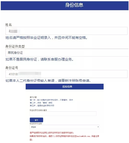 3、根據(jù)提示,填寫身份信息及相關(guān)院校信息、專業(yè)信息。