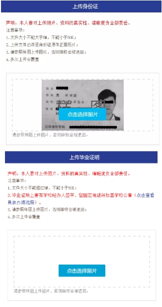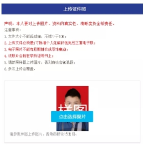 4、信息填完后,開始上傳照片。上傳以下圖片“身份證正面照片、畢業(yè)證完整照、個人一寸近期紅底登記照(切記個人照片不要和畢業(yè)證照片一樣)”