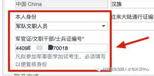 (二)現(xiàn)役軍人和部隊(duì)文職人員報(bào)名時(shí),須使用有效的居民身份證進(jìn)行申報(bào),在網(wǎng)報(bào)系統(tǒng)本人身份一欄中選擇相應(yīng)的“軍人”身份,并填寫相關(guān)的軍官證、警官證、文職干部證、士兵(官)證和軍隊(duì)學(xué)員證等證件號(hào)碼。
