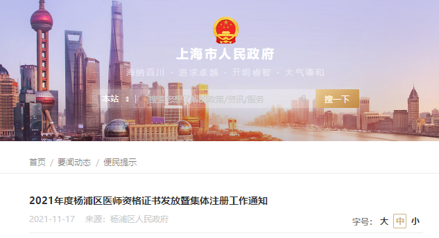 上海市楊浦區(qū)2021年度中西醫(yī)執(zhí)業(yè)醫(yī)師資格證書發(fā)放暨集體注冊(cè)工作通知