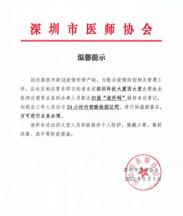 因近期我市新冠疫情形勢(shì)嚴(yán)峻,為配合疫情防控相關(guān)管理工作,應(yīng)社區(qū)相應(yīng)要求即日起請(qǐng)來訪深圳科技大廈西大堂辦理執(zhí)業(yè)醫(yī)師注冊(cè)等業(yè)務(wù)的辦事人員配合掃描“場(chǎng)所碼”做好來訪登記,向我會(huì)工作人員出示24小時(shí)內(nèi)核酸檢測(cè)證明,進(jìn)行體溫測(cè)量后,方可進(jìn)行業(yè)務(wù)辦理。