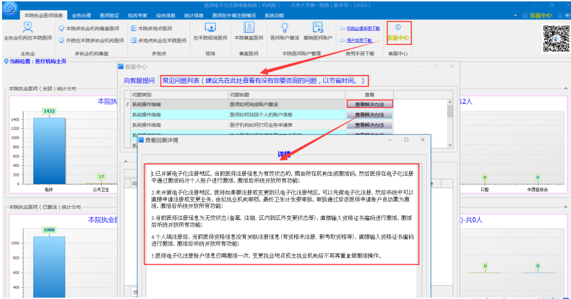 如果是醫(yī)療機構(gòu)在使用系統(tǒng)時遇到了問題,請點擊右上角“客服中心”,首先可以查看常見問題列表,看看有沒有您要咨詢的問題。