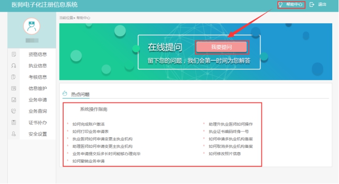 醫(yī)師個(gè)人如果在使用系統(tǒng)時(shí)遇到了問題,請點(diǎn)擊右上角“幫助中心”,首先查看下方熱點(diǎn)問題,如果還不能解決問題,您可以點(diǎn)擊“我要提問”,將問題描述清楚后提交。