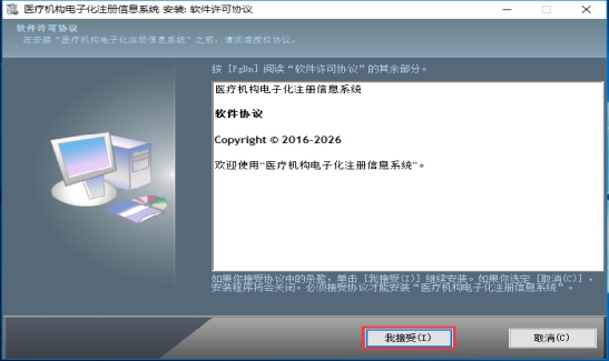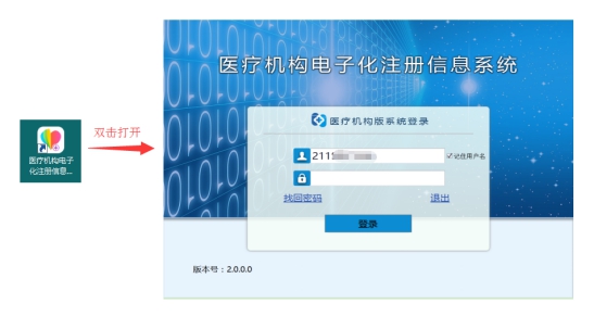 打開您下載且已經(jīng)解壓的目錄文件,雙擊“醫(yī)療機構電子化注冊信息系統(tǒng)-機構版.exe”程序會自動運行,并彈出窗口,如圖所示: