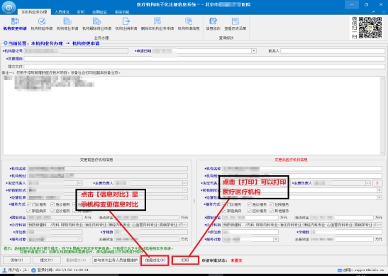 l 提交機構變更申請后,點擊【信息對比】可以查看變更后信息與變更前信息的對比,點擊【打印】按鈕可以打印機構變更申請書。如圖所示: