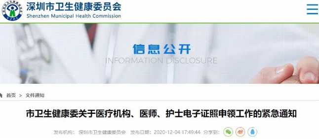 深圳市衛(wèi)生健康委關(guān)于醫(yī)療機(jī)構(gòu)、醫(yī)師、護(hù)士電子證照申領(lǐng)工作發(fā)布緊急通知,2021年1月1日起,國家衛(wèi)生健康委電子注冊和電子證照系統(tǒng)將停止申領(lǐng)電子證照,未按時申領(lǐng)電子證照的醫(yī)療機(jī)構(gòu)、醫(yī)師、護(hù)士將無法辦理相關(guān)業(yè)務(wù),其損失和后果將由該醫(yī)療機(jī)構(gòu)、醫(yī)師或護(hù)士自行承擔(dān)。