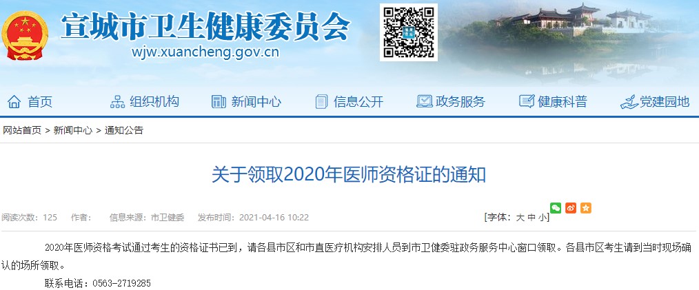中西醫(yī)執(zhí)業(yè)醫(yī)師資格考試宣城市2020年筆試合格證書領(lǐng)取通知