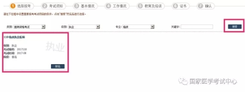 選擇需要報(bào)考的項(xiàng)目,我們以醫(yī)師資格考試中西醫(yī)執(zhí)業(yè)助理醫(yī)師為例,在下方的類別中,選擇醫(yī)師資格考試,級(jí)別選擇執(zhí)業(yè),專業(yè)選擇中醫(yī),然后點(diǎn)擊搜索,下方將顯示考試項(xiàng)目,確認(rèn)是自己報(bào)名的考試項(xiàng)目后,點(diǎn)擊報(bào)名按鈕。