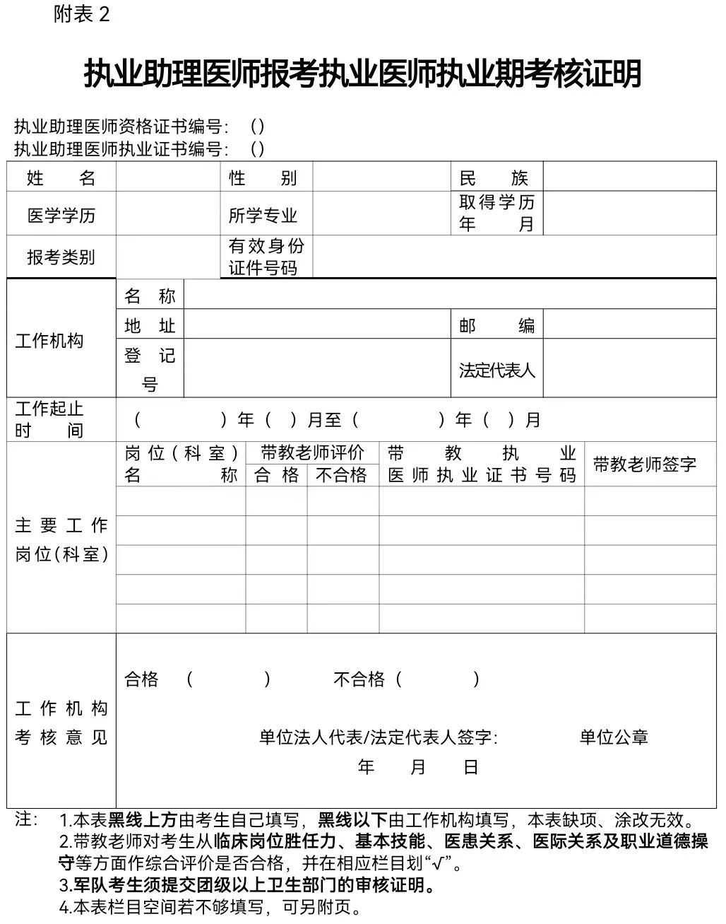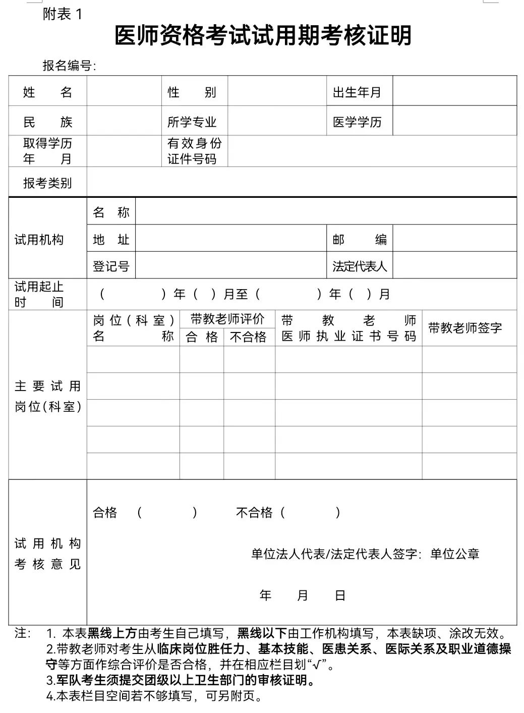3.《試用期考核合格證明》(附件1)原件,獲得執(zhí)業(yè)助理醫(yī)師資格后報考執(zhí)業(yè)醫(yī)師的考生需提交《執(zhí)業(yè)助理醫(yī)師報考執(zhí)業(yè)醫(yī)師執(zhí)業(yè)期考核證明》(附件2)原件。