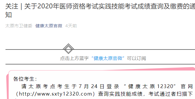 請?zhí)键c考生于7月24日登錄“健康太原12320”官網(http://www.sxty12320.com)查詢實踐技能成績,考試通過者掃描下方二維碼,支付醫(yī)學綜合考試費用。