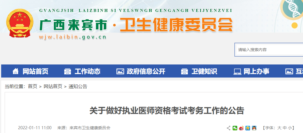 根據(jù)國家和自治區(qū)醫(yī)考中心統(tǒng)一部署,為做好2022年來賓市考點醫(yī)師資格考試考務(wù)工作,現(xiàn)將有關(guān)事項公告如下: