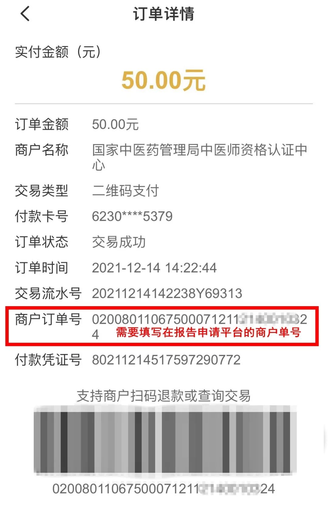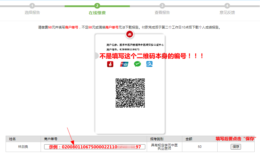 3.繳費(fèi)成功后需填寫完整商戶單號(hào),并點(diǎn)擊“保存”。支付時(shí)可備注考生本人姓名。