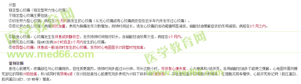 3.誘因:發(fā)作常由體力勞動或情緒激動(如憤怒、焦急、過度興奮等)所誘發(fā)醫(yī)學|教育網(wǎng),飽食、寒冷、吸煙、心動過速、休克等亦可誘發(fā)。