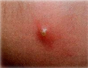 局部癥狀 初起毛囊處有紅、腫、熱、痛的小結(jié)節(jié),逐漸腫大并隆起,數(shù)天后中央部組織壞死,出現(xiàn)膿栓。