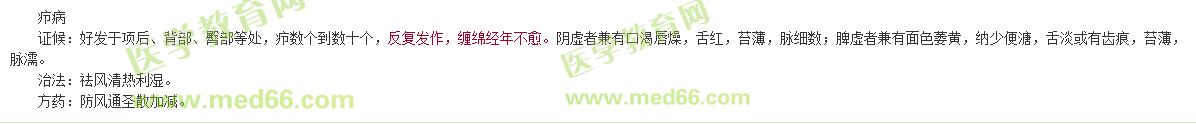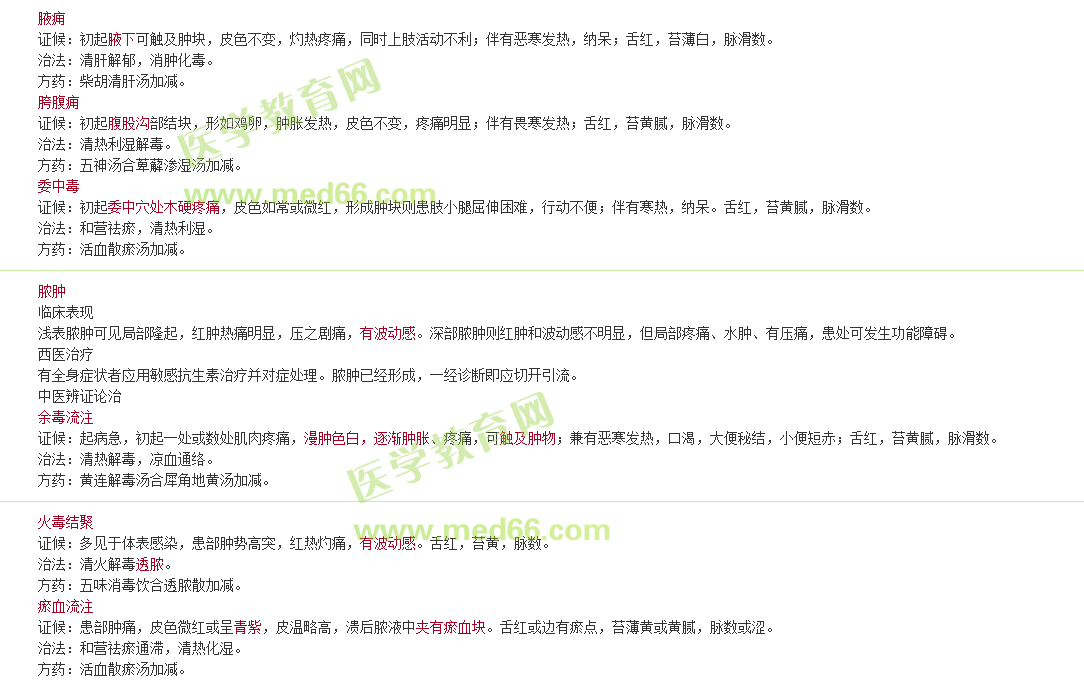 證候:發(fā)于腰胯脅下,大片鮮紅,紅腫蔓延,摸之灼手,腫脹觸痛;舌紅,苔黃膩醫(yī)學(xué)|教育網(wǎng),脈弦滑數(shù)。