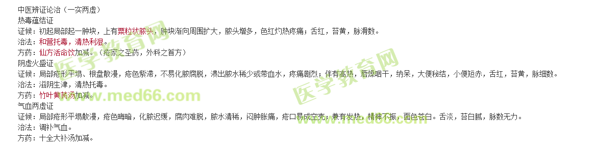 證候:初起局部皮膚潮紅,次日發(fā)生腫痛,根角很淺,范圍局限醫(yī)學(xué)|教育網(wǎng),多在3cm左右。舌苔黃,脈數(shù)。