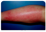 好發(fā)部位為下肢和頭面部。起病急,患者常有頭痛、畏寒、發(fā)熱等全身癥狀。局部表現(xiàn)呈片狀紅疹,顏色鮮紅,中間較淡,邊緣清楚,略為隆起。手指輕壓可使紅色消退,松壓后很快又恢復(fù)鮮紅色。紅腫向四周擴(kuò)展時(shí)醫(yī)學(xué)|教育網(wǎng),中央紅色逐漸消退、脫屑,轉(zhuǎn)為棕黃色。紅腫區(qū)有時(shí)有水皰形成,局部有燒灼樣疼痛。