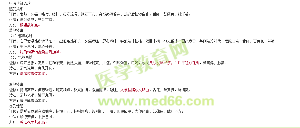 4.有明顯的原發(fā)疾病,如感冒、肺炎喘嗽、疫毒痢、流行性腮腺炎、流行性乙型腦炎等。中樞神經(jīng)系統(tǒng)感染者,神經(jīng)系統(tǒng)檢查病理反射陽(yáng)性。