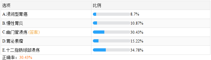 2.患者男性,30歲。1年來胃痛,無典型的周期性和節(jié)律性疼痛,反酸,餐后多出現(xiàn)劇烈疼痛,制酸劑療效差,有多次上消化道出血史。合適的診斷是
