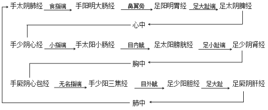 2.十二經(jīng)脈循行走向與交接規(guī)律:十二經(jīng)脈的循行走向規(guī)律:手三陰經(jīng)從胸走手,手三陽(yáng)經(jīng)從手走頭,足三陽(yáng)經(jīng)從頭走足,足三陰經(jīng)從足走腹胸。十二經(jīng)脈的循行交接規(guī)律是: