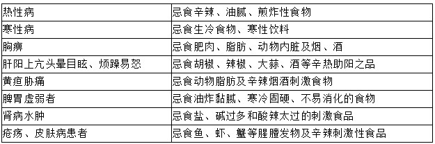 一般忌食生冷、辛熱、油膩、腥膻、有刺激性的食物。根據(jù)病情的不同,飲食禁忌也有區(qū)別。
