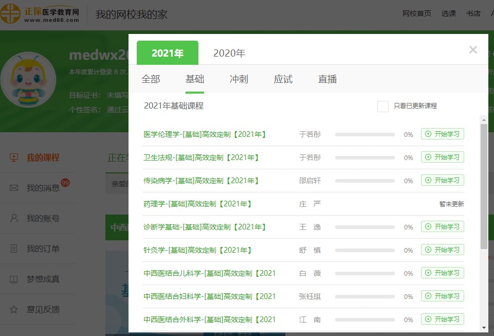 在線聽課:新課基礎(chǔ)班已開通,購買醫(yī)學(xué)教育網(wǎng)2021年中西醫(yī)結(jié)合助理醫(yī)師資格考試輔導(dǎo)課程,即可立即聽課。