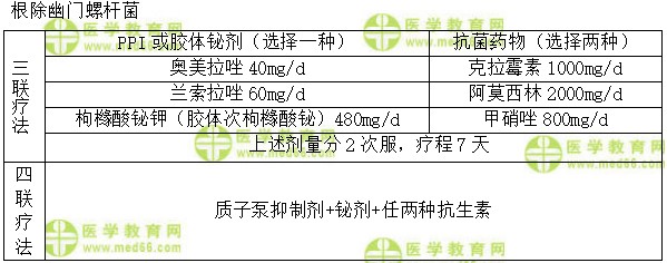 【答案解析】三聯(lián)療法為質(zhì)子泵抑制劑或鉍劑,再加上克拉霉素、阿莫西林、甲硝唑中選擇兩種。四聯(lián)療法為質(zhì)子泵抑制劑與鉍劑合用,再加上任兩種抗生素。