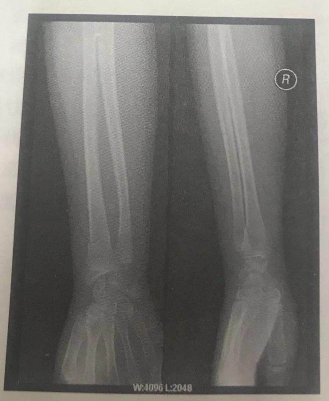 【正確答案】 參考答題要點(diǎn):右撓骨遠(yuǎn)端青枝骨折。