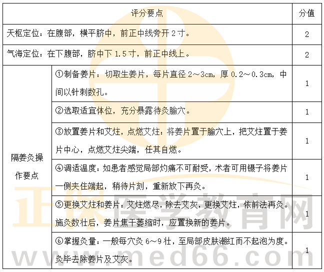 2.試述天樞、氣海穴定位,并演示隔姜灸的操作。(10分)