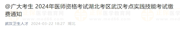 湖北考區(qū)武漢考點(diǎn)2024年國家醫(yī)師資格考試實(shí)踐技能考試將開放繳費(fèi)窗口,資格審核通過考生請(qǐng)于3月23日——3月28日期間完成繳費(fèi)。逾期未繳費(fèi)的考生,視為放棄此次考試。
