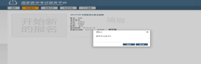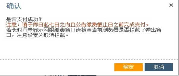 4.繳費成功后回到系統(tǒng)中,系統(tǒng)會詢問是否支付成功,若成功點擊“確定”按鈕,之后在報考項目中繳費狀態(tài)顯示“已繳費”。由于銀行接口通訊存在延時的情況,若當(dāng)時未能顯示“已繳費”,請注意等待幾分鐘之后刷新頁面再進(jìn)行查看。