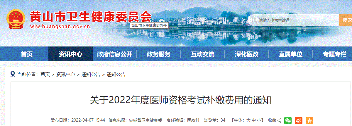 安徽黃山市2022年度醫(yī)師資格考試補繳費用的通知!