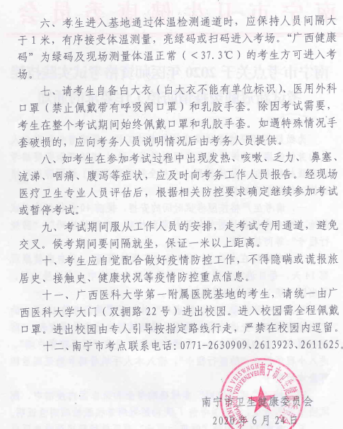 南寧市考點(diǎn)關(guān)于2020年醫(yī)師資格考試實(shí)踐技能考試新冠疫情防控工作要求的通知