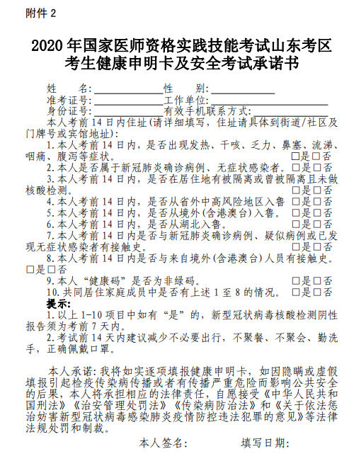 2020年實(shí)踐技能考試山東考區(qū)考生健康申明卡及安全考試承諾書(shū)