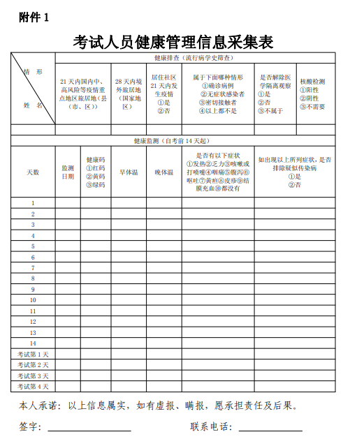 考生、考官和考務(wù)工作人員均納入考試人員健康管理,考前14天起每天采取自查自報(bào)方式進(jìn)行健康監(jiān)測(cè),填寫《考試人員健康信息采集表》。瞞報(bào)、虛報(bào)個(gè)人旅居史和健康癥狀的,依法依規(guī)予以處理。