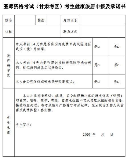 2020年國(guó)家醫(yī)師資格考試甘肅考區(qū)考生健康旅居申報(bào)及承諾書(shū)