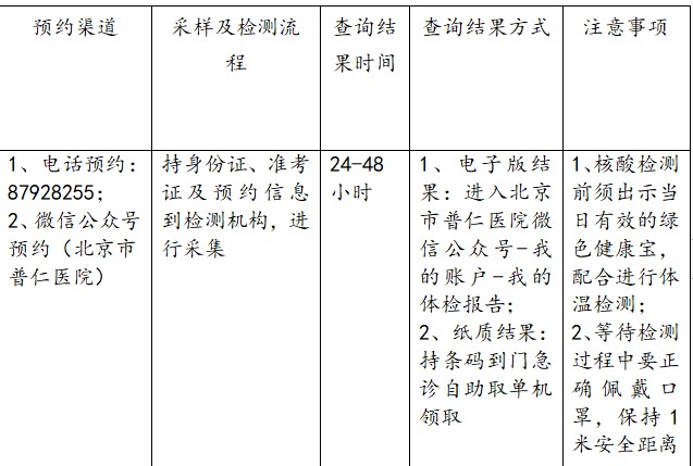 普仁醫(yī)院2020年中西醫(yī)結(jié)合助理醫(yī)師技能考生免費(fèi)預(yù)約核酸檢測(cè)預(yù)約需要哪些流程?根據(jù)近期北京市新冠肺炎疫情防控形勢(shì),為保障順利完成2020年度國(guó)家醫(yī)師資格考試工作,經(jīng)批準(zhǔn),要求所有考生需持7日內(nèi)核酸檢測(cè)陰性報(bào)告方可入場(chǎng)考試。