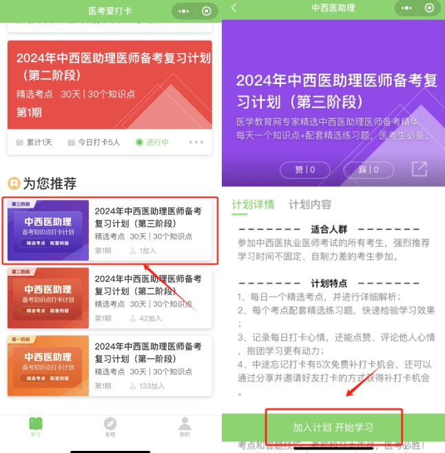 請(qǐng)選擇“您的備考計(jì)劃”,如中西醫(yī)助理醫(yī)師備考復(fù)習(xí)計(jì)劃(第三階段),然后點(diǎn)擊下方“加入計(jì)劃開始學(xué)習(xí)”按鈕,開始正式進(jìn)入打卡學(xué)習(xí);