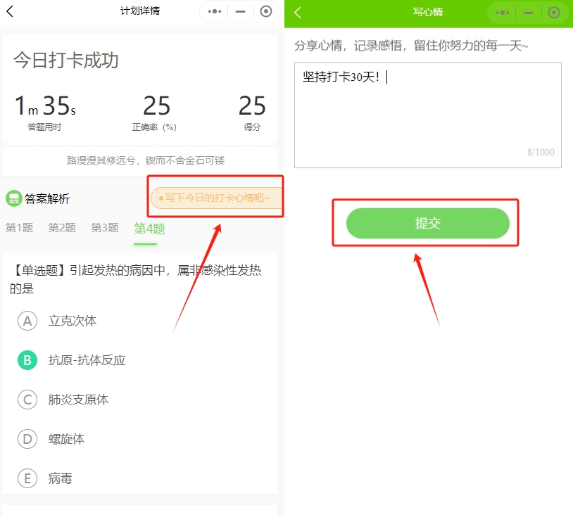 做完題后,可以查看每道題的解析和整體做題情況,然后點(diǎn)擊“分享今日打卡心情”,輸入您要記錄的內(nèi)容,提交即可完成打卡。