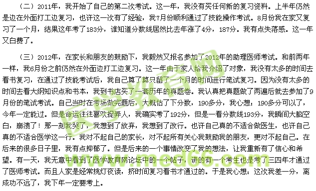(四)2013年,這一年,我在身邊所有人的質(zhì)疑下,我頂住壓力繼續(xù)報(bào)名參加了助理醫(yī)師考試。書上經(jīng)常說成功要找對(duì)方法,從前幾次我的考試成績來看,也許是自己的復(fù)習(xí)方法有點(diǎn)問題,于是在朋友的推薦下,我報(bào)名參加了醫(yī)學(xué)教育網(wǎng)的網(wǎng)校。因?yàn)樗彩强剂藘纱螞]過關(guān),最后報(bào)醫(yī)學(xué)教育網(wǎng)的網(wǎng)校才通過醫(yī)師考試的。終于上天還是公平的,我這次考了204分,超出了分?jǐn)?shù)線17分,順利的通過了助理醫(yī)師考試。