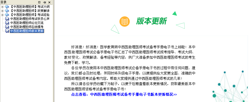 同時(shí),我們會(huì)根據(jù)知識(shí)點(diǎn)的變化、問題反饋及建議,不斷更新版本、豐富內(nèi)容,以便提供給大家更全面的中西醫(yī)助理醫(yī)師考試備考內(nèi)容。幫助大家提高考試通過幾率!目前版本已經(jīng)升級(jí)到2017年中西醫(yī)助理醫(yī)師考試備考手冊(cè)電子書V7.0,報(bào)考指南和政策解讀欄目內(nèi)容都有更新,請(qǐng)考生及時(shí)查看。