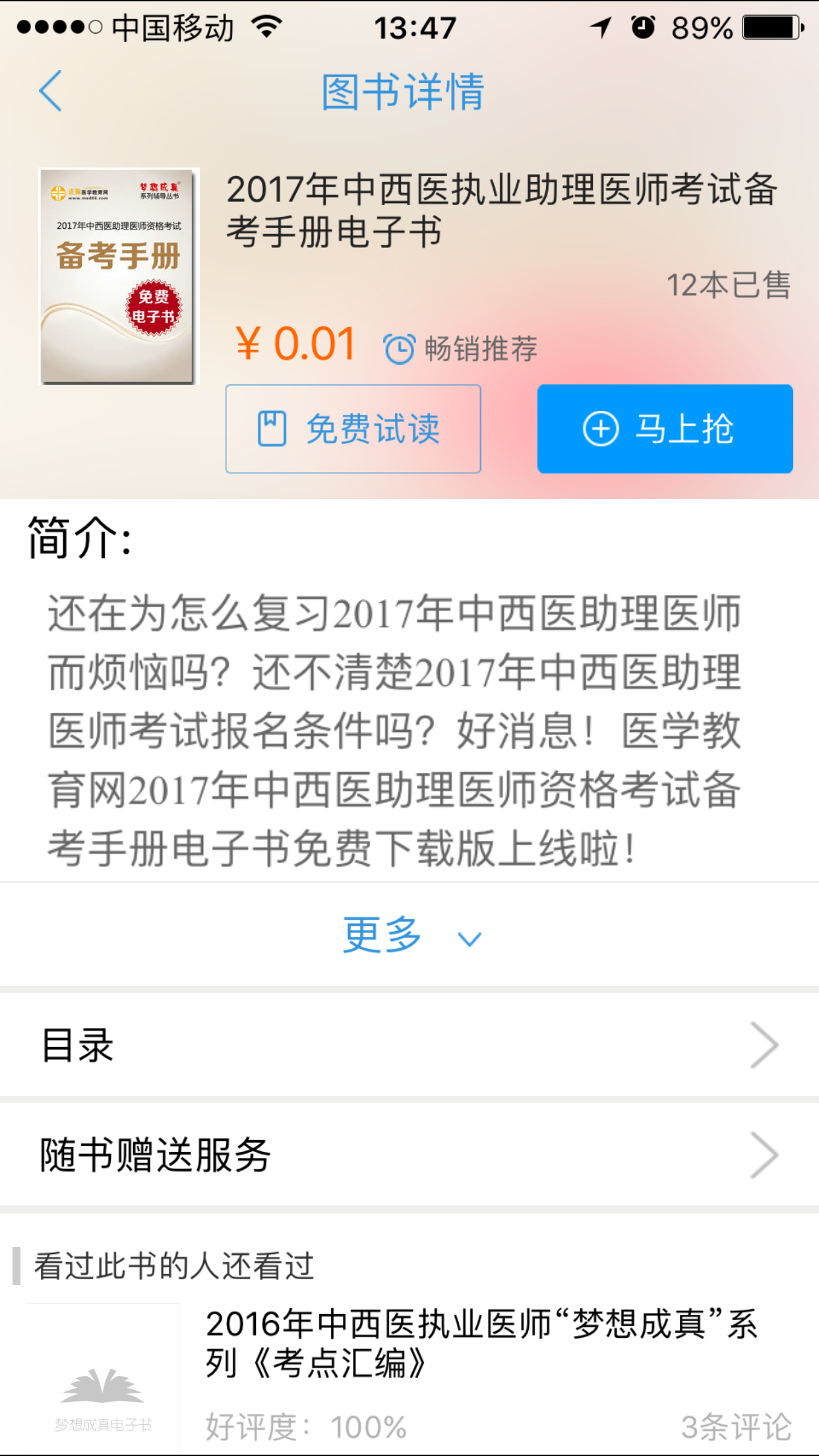 第三步:進(jìn)入“圖書詳情”頁面直接點(diǎn)擊“免費(fèi)試讀”(因系統(tǒng)限制,無法支持0元購買,但點(diǎn)擊“免費(fèi)試讀”可免費(fèi)觀看全部內(nèi)容),就可以愉快地開始學(xué)習(xí)啦!