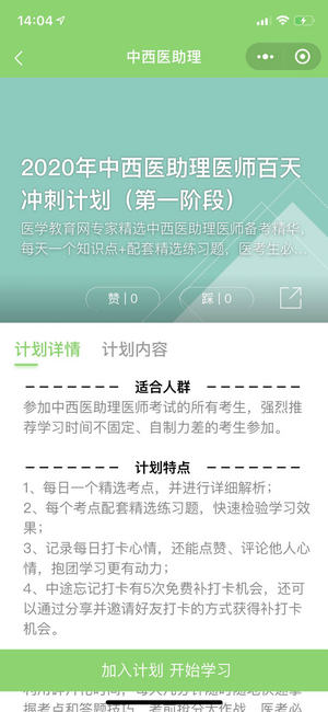 第三步:選擇備考科目后即進(jìn)入學(xué)習(xí)計(jì)劃選擇的頁(yè)面,請(qǐng)選擇“您的備考計(jì)劃”,如中西醫(yī)執(zhí)業(yè)醫(yī)師百天沖刺計(jì)劃(第一階段),然后點(diǎn)擊下方“加入計(jì)劃 開(kāi)始學(xué)習(xí)”按鈕,開(kāi)始正式進(jìn)入打卡學(xué)習(xí)。