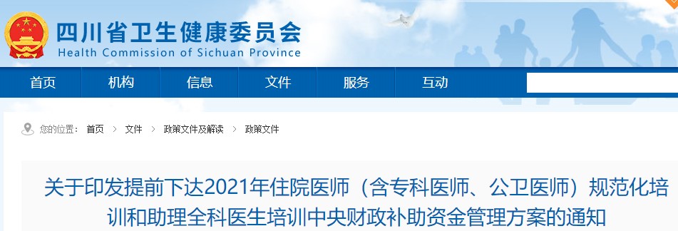 近日,四川省衛(wèi)健委發(fā)布《關于印發(fā)提前下達2021年住院醫(yī)師(含專科醫(yī)師、公衛(wèi)醫(yī)師)規(guī)范化培訓和助理全科醫(yī)生培訓中央財政補助資金管理方案的通知》(以下簡稱《通知》)。
