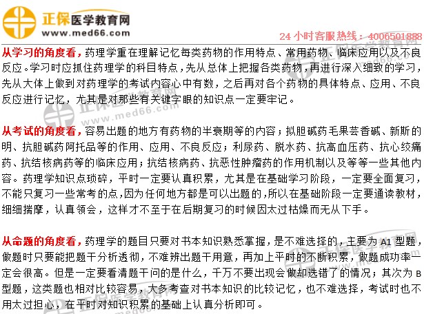 面對藥理學(xué),首先不要排斥,不要有抵觸心理,任何一門課程的學(xué)習(xí)都需要考生熟悉教材,而本科目中,作用特點以及機制之類的內(nèi)容是需要理解的,在此基礎(chǔ)之上對臨床應(yīng)用以及不良反應(yīng)加以分析,更有利于記憶。通過一遍或者若干遍的教材研讀,建立起知識框架,掌握本門課程的知識體系,并在此過程中,結(jié)合預(yù)習(xí)效果,對于已經(jīng)掌握的知識進行鞏固,對于沒有掌握好的細節(jié)內(nèi)容進行深化記憶,消化重點難點知識,爭取能夠用自己的觀點表達教材內(nèi)容,這樣做題的時候,才能做到以不變應(yīng)萬變。