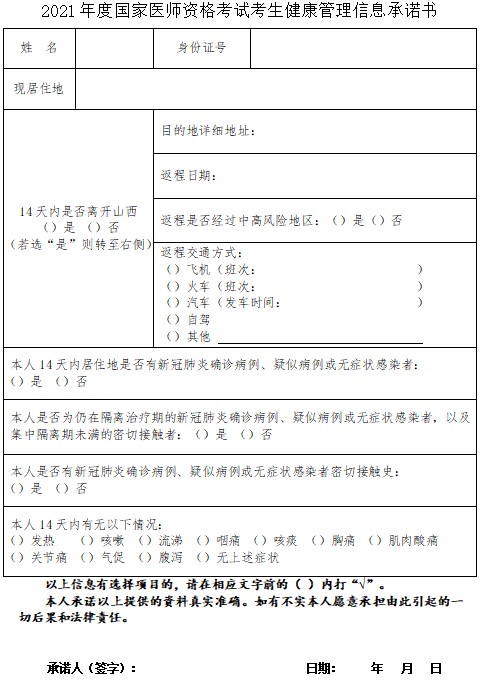 山西省2021年度國家醫(yī)師資格考試考生健康管理信息承諾書