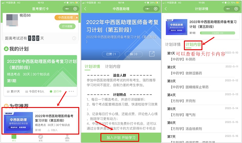 如中西醫(yī)助理醫(yī)師備考復(fù)習(xí)計劃(第五階段),然后點擊下方“加入計劃 開始學(xué)習(xí)”按鈕,開始正式進(jìn)入打卡學(xué)習(xí)。